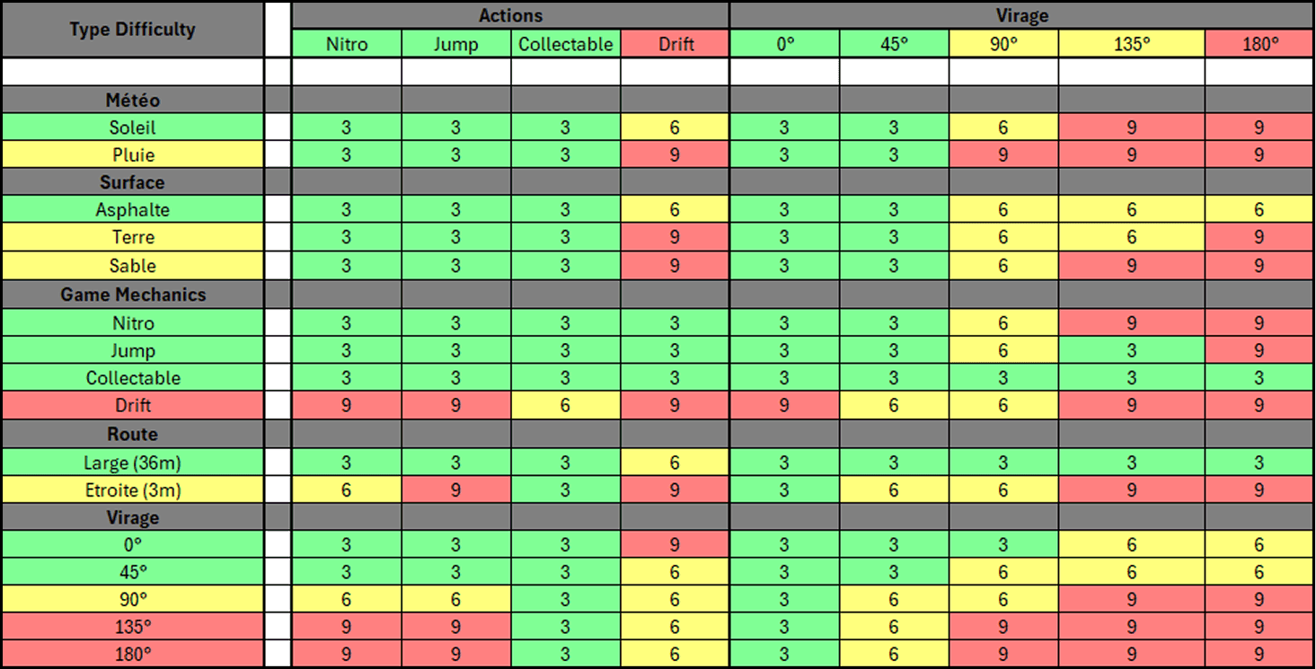 Before moving on to video games, I stayed with reality and created a table listing the various difficulties: weather, ground surface, road width, turning angle. I also decided to add more arcade-style elements.