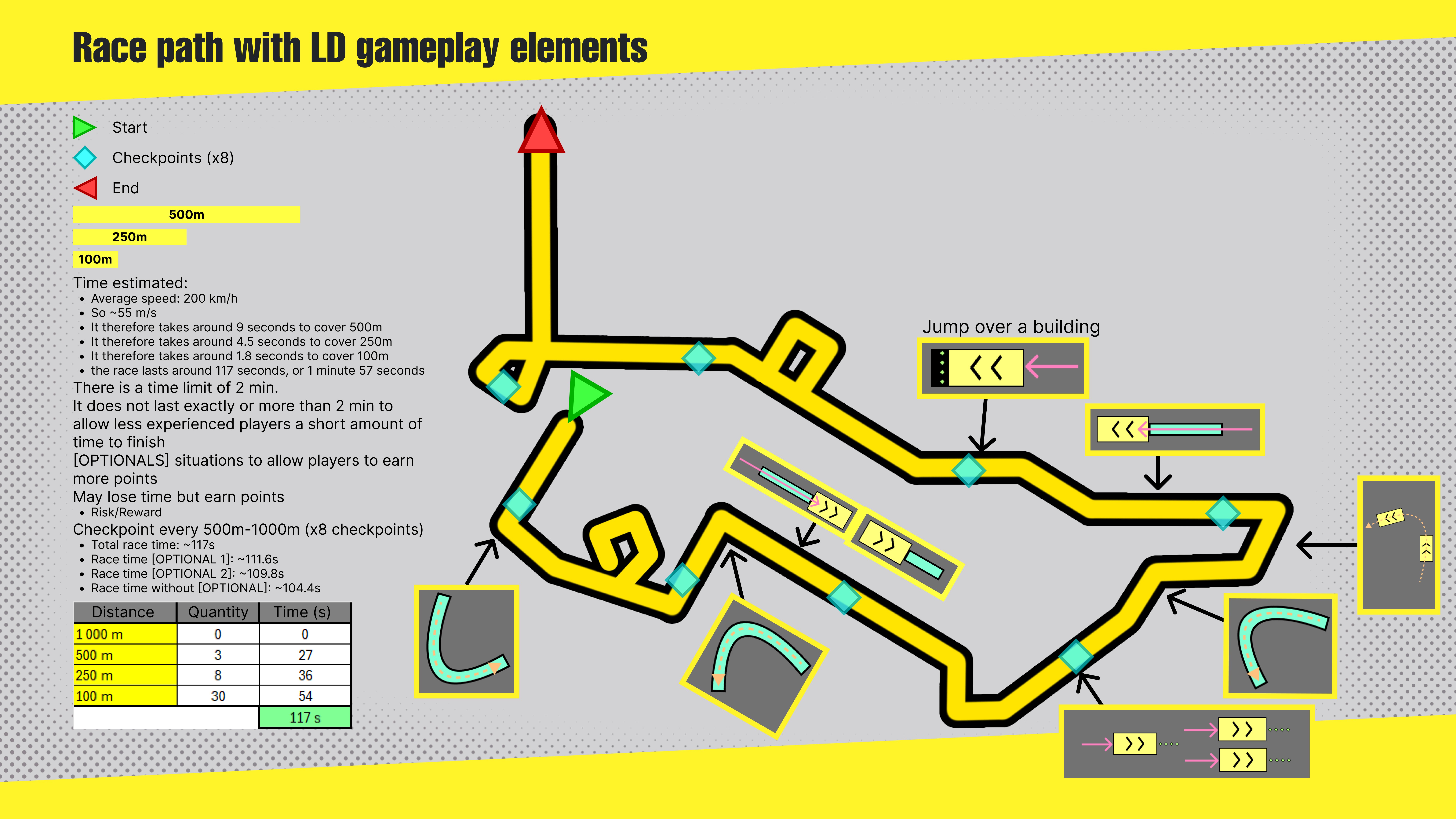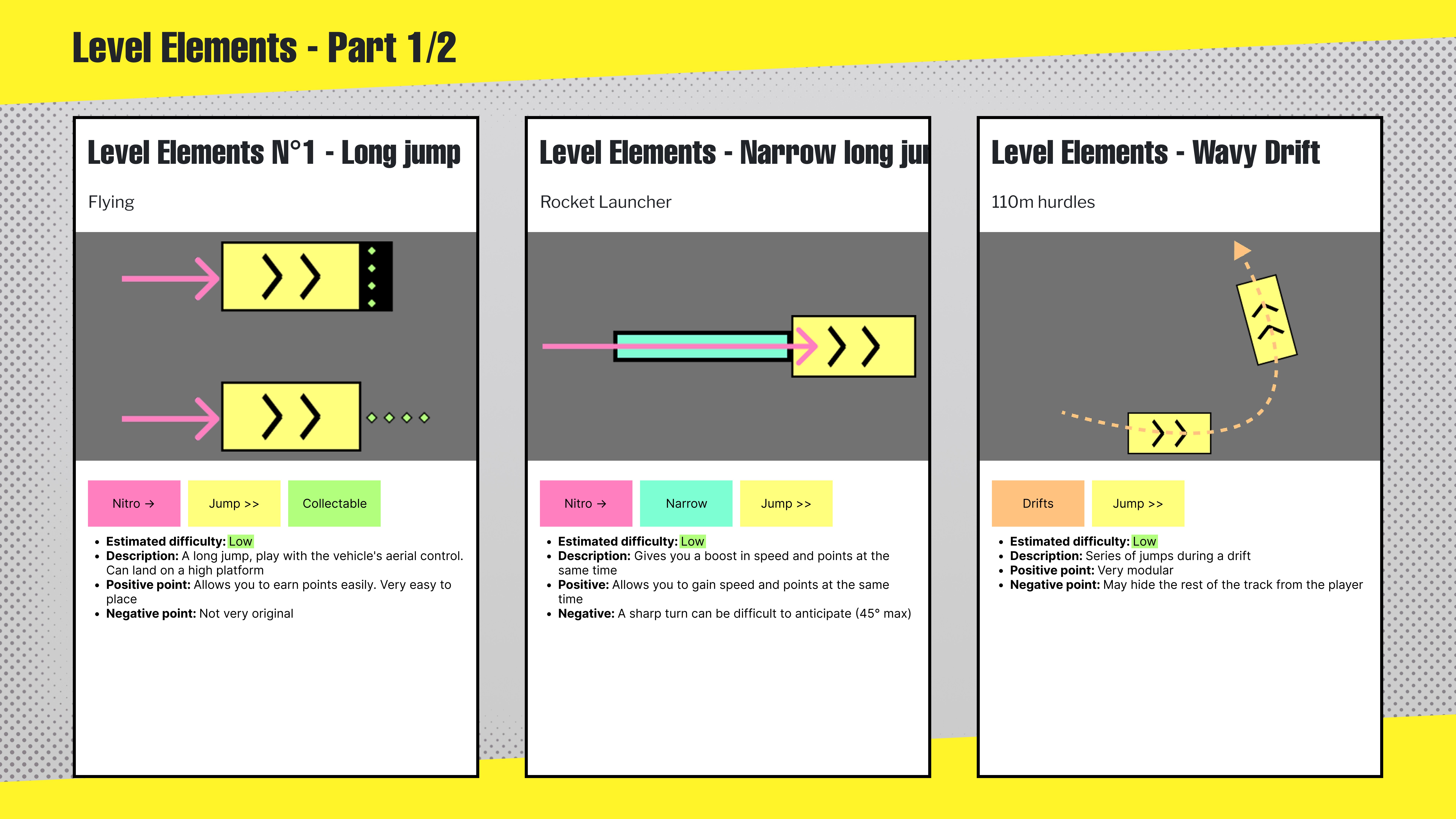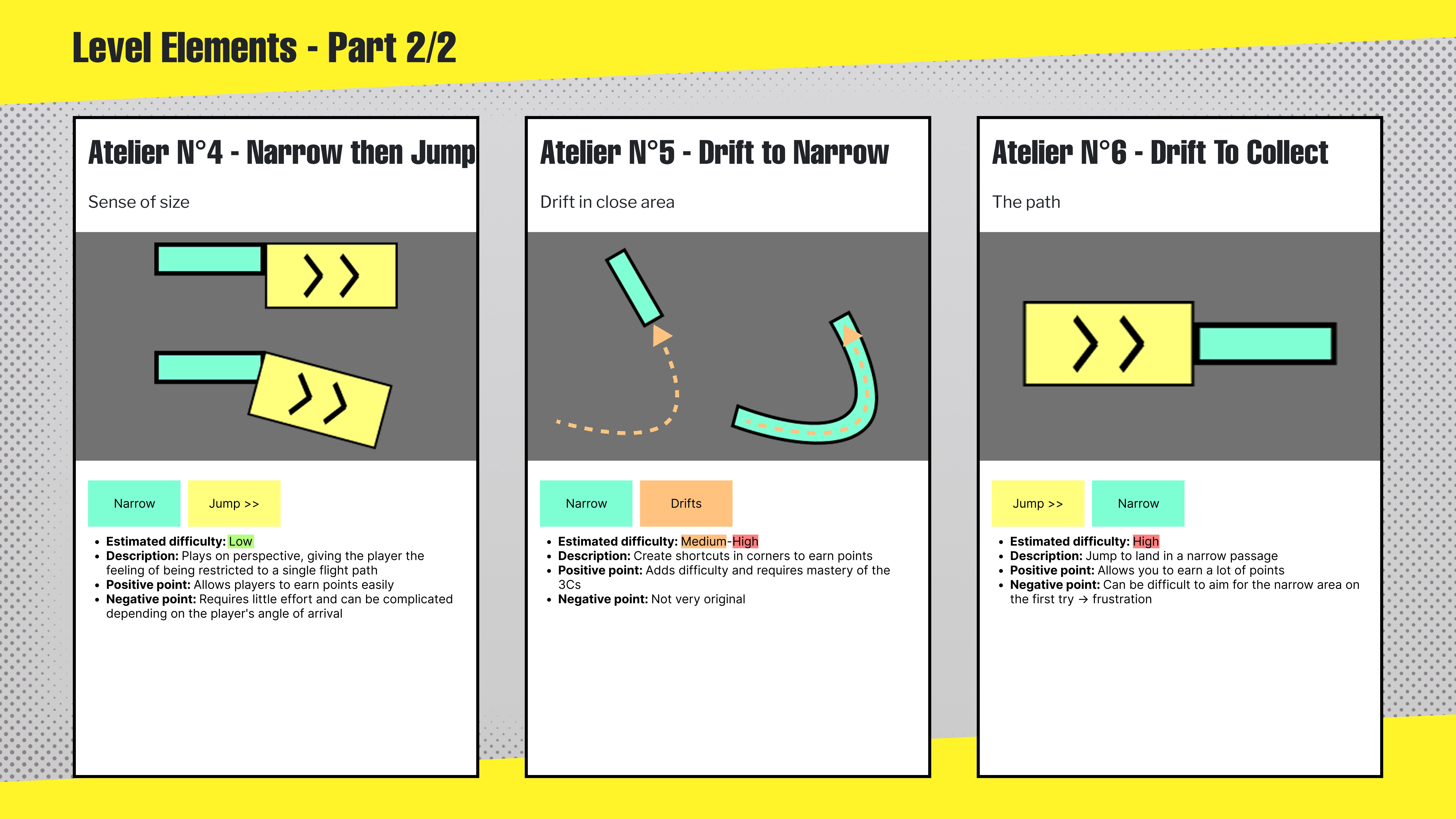 About the Level elements, I created optional situations to let the player choose to increase himself the difficulty: take the optional path and spend more time, but gain more points. It's a risk/reward situation.