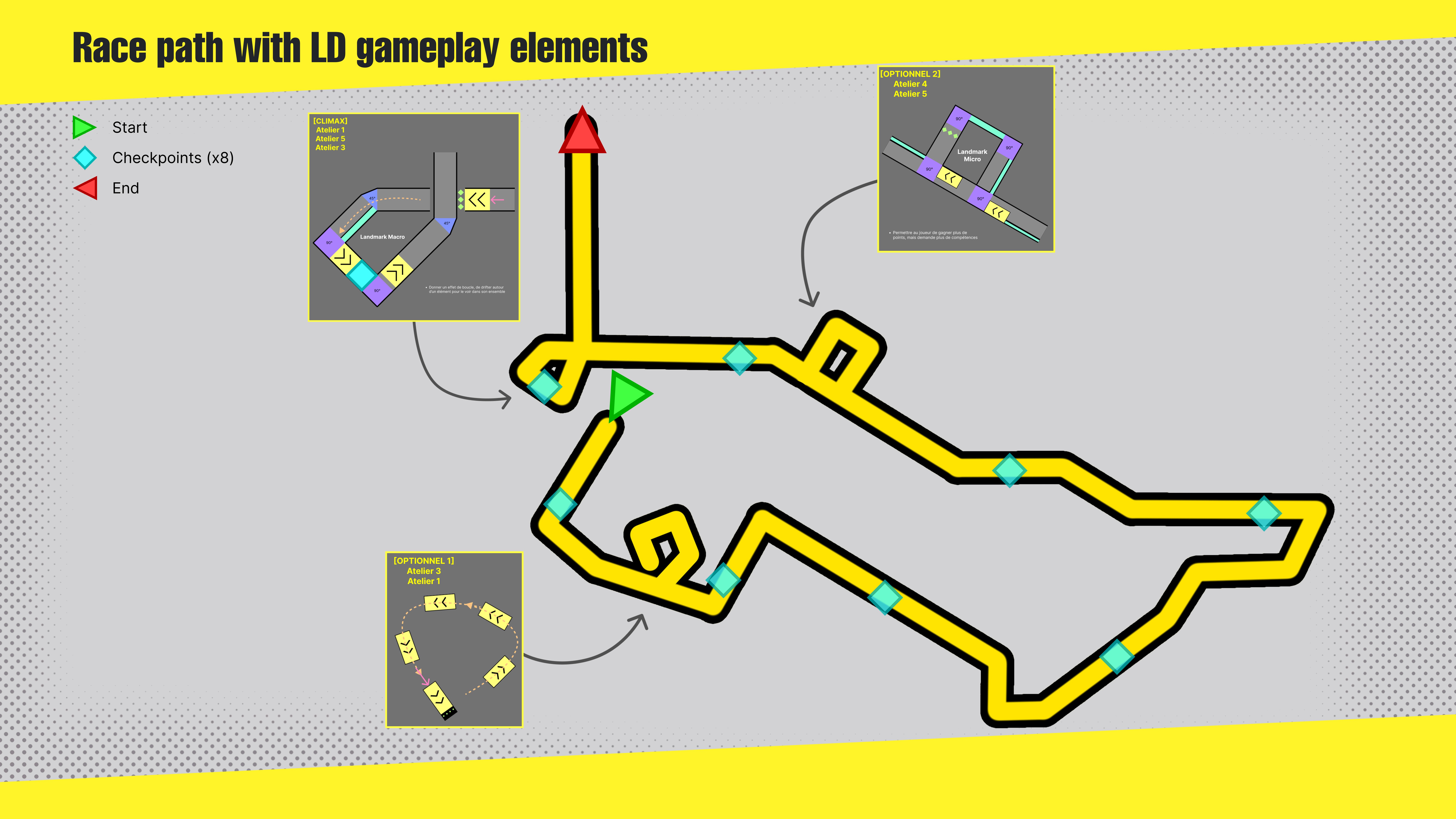 I challenge myself to create a race level concept for a racing game, but I didn't have any experience in that game genre. The challenge was to understand the principle, and this is how I proceed.